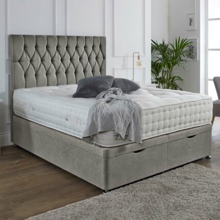 Albans Ottoman End Lift Storage Divan Bed – Classic Orthopaedic Support Open Coil mattress – Floor Standing Headboard